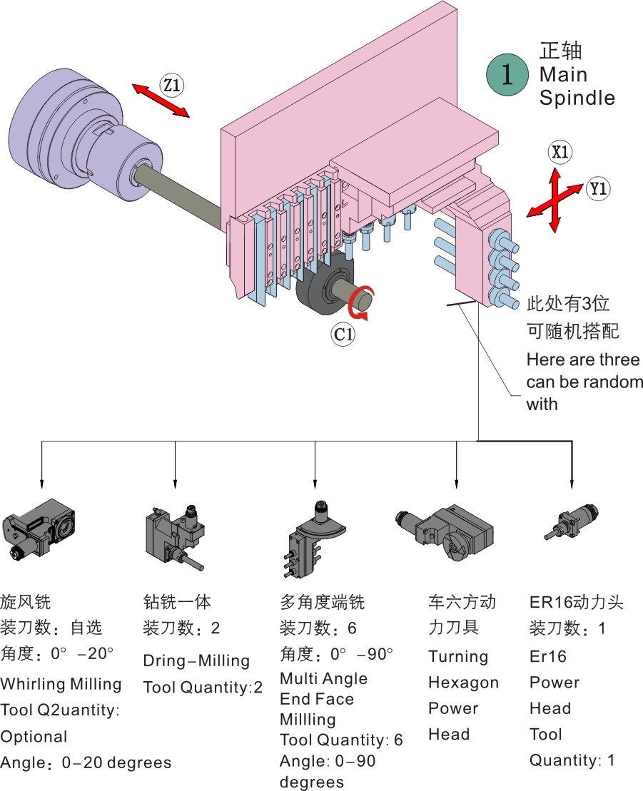 | 主轴侧面动力头 | 4支 | 2支ER11+2支ER16 | |